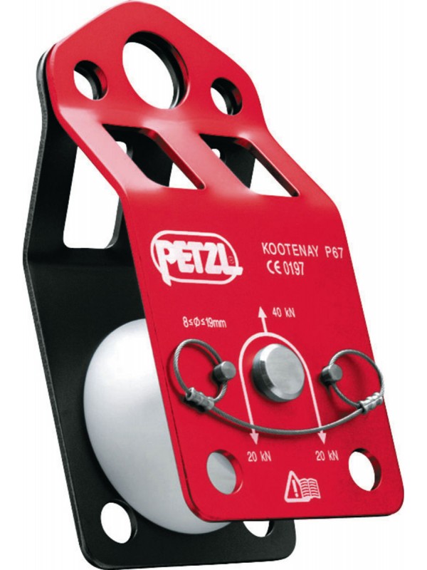 БЛОК ДЛЯ ПРОПУСКАНИЯ ВЕРЕВКИ С УЗЛАМИ Большое пространство между верхней границей щёчек и роликом позволяет пропускать верёвку с узлами (спускать и поднимать большие грузы на большую высоту или организовывать переправы на двух верёвках). Ролик большого диаметра обеспечивает высокий КПД. Запирающие штифты позволяют блокировать вращение и использывать блок как точку страховки.