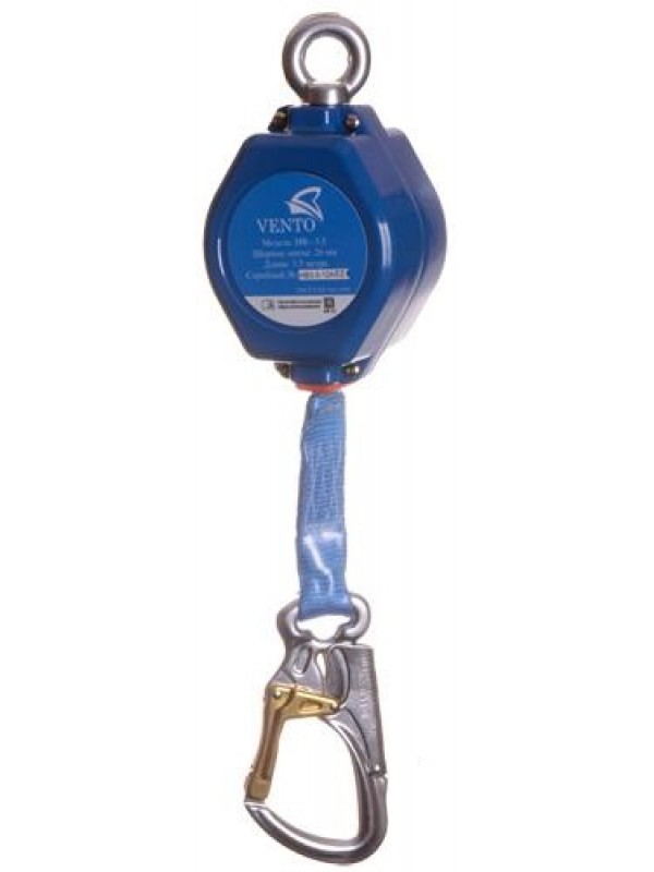 Механизм защищен металлическим корпусом. По мере необходимости лента свободно выдается из устройства и автоматически наматывается обратно. При резком увеличении скорости вытягивания стропы (при срыве) срабатывает функция торможения, прекращающая падение пользователя. Встроенный в защитный корпус вертлюг предотвращает перекручивание ленты в ходе использования. Имеется индикатор срыва в виде разрываемого шва. Для пользователей, масса которых вместе с индивидуальным оборудованием не превышает 150 кг. Внимание! Работники, массой от 100 до 150 кг (вместе с оборудованием), должны создавать системы обеспечения безопасности с фактором рывка не более 1. «НВ-03» комплектуется шнуром для вытягивания ленты и карабином «Овал» Характеристики Масса, г: 1950 Длина ленты,м: 3,5 Ширина ленты, мм: 25 Раскрытие карабина,мм: 25 Размер корпуса, мм: 101*125*76