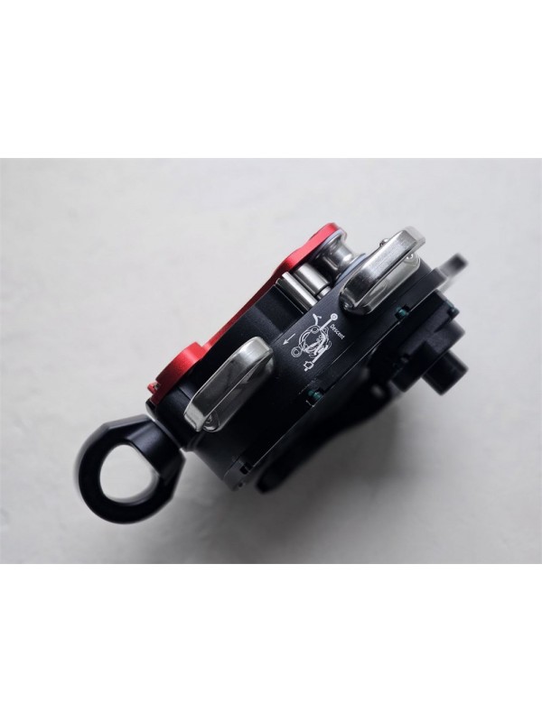 Устройство имеет защиту от зажевывания веревки и стало менее восприимчиво к характеристикам каната. Крюк вынесен ближе к плоскости выхода веревки из колеса для меньшего закручивания на спуске.