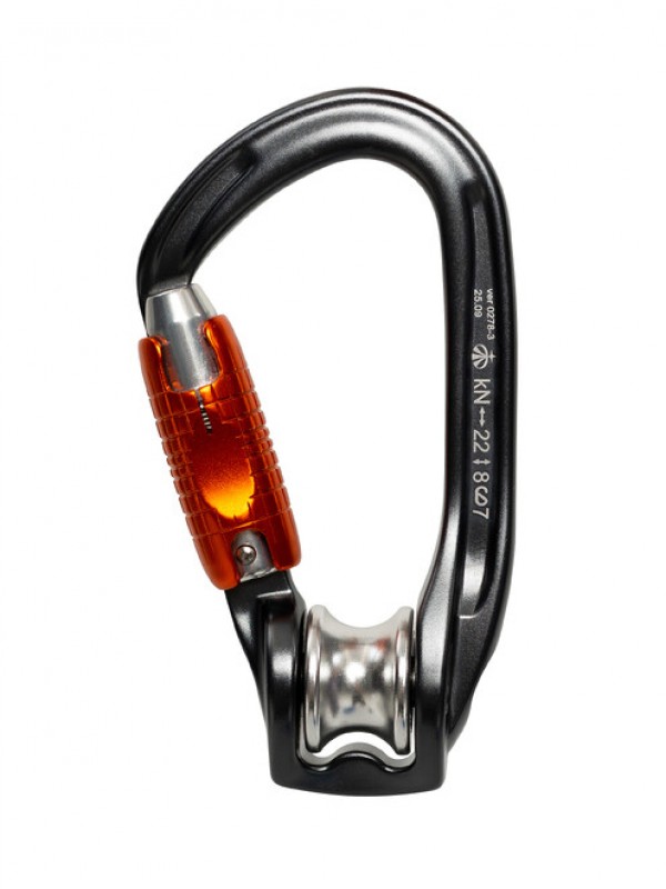 Карабин со встроенным роликом образует более компактную систему, чем отдельные соединительное звено и блок-ролик. Он позволяет встёгивать и выстёгивать веревку, не отсоединяя карабина, а также даёт возможность работать одной рукой.