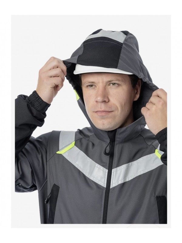 коленей ·Область колен с мягкой амортизирующей прослойкой ·Двухзамковая центральная молния ·Капюшон регулируется, можно носить с каской ·Пояс спинки с эластичной тесьмой ·Вентиляционные молнии в подмышках, отверстия в области