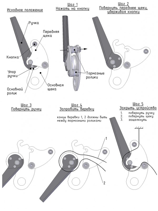 спуска по веревке диаметром 10-11мм, с остановкой при отпускании ручки. Устройство обладает рядом преимуществ: устройство не