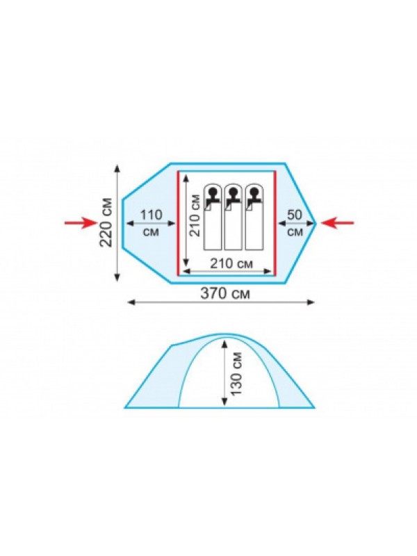 Трехдуговая модель конструкции "полусфера" с просторным тамбуром, двумя входами и снежной юбкой по периметру внешнего тента.