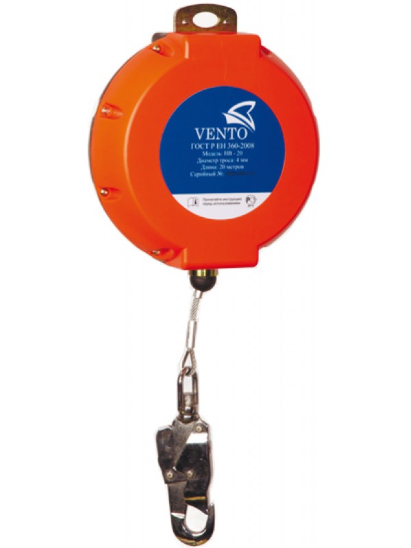 Оптимально подходит для эксплуатации в сложных условиях, в местах, где возможен контакт с агрессивными химическими веществами, при проведении сварочных работ или при использовании обрезного инструмента. Механизм защищен корпусом из композитного противоударного пластика. По мере необходимости трос свободно выдается из устройства и автоматически наматывается обратно. При резком увеличении скорости вытягивания стропы (при срыве) срабатывает функция торможения, прекращающая падение пользователя. Карабин на конце троса имеет вертлюг для предотвращения перекручивания стропы. Индикатор срыва находится на вертлюге. «НВ-20» комплектуется шнуром для вытягивания ленты, карабином «Стальной Овал» и фалом крепежным для организации точки крепления. Устройство поставляется в специальной сумке для хранения и переноски. Характеристики Масса, г: 11700 Длина ленты,м: 20 Диаметр троса, мм: 4 Раскрытие карабина,мм: 21 Размер корпуса, мм: 256*249*113
