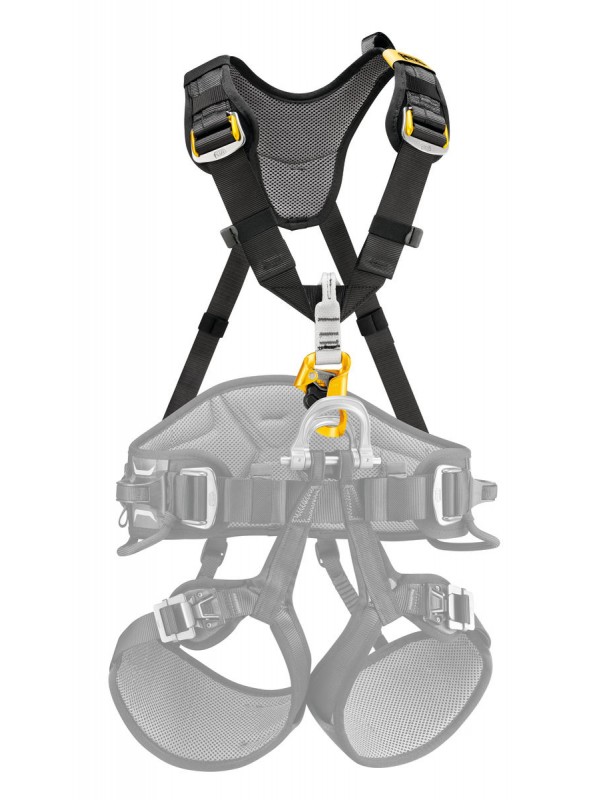 Наплечные ремни к привязям для положения сидя Наплечные ремни TOP CROLL S с интегрированным зажимом CROLL S используются совместно с привязями ASTRO SIT FAST, AVAO SIT, AVAO SIT FAST, FALCON и FALCON ASCENT, SEQUOIA SRT трансформируя их в комбинированные привязи. Текстильный грудной элемент А для присоединения соединительно-амортизирующей подсистемы страховочной системы, снижает вес и габариты привязи. Наплечные лямки снабжены подкладкой из пеноматериала. Лямки широко раздвинуты и не натирают шею. Они обеспечивают равномерное распределение нагрузки на пояс и плечи работника. Наплечные ремни крепятся к привязи для положения сидя в задней части пояса двумя лямками, что обеспечивает повышенную стабильность.