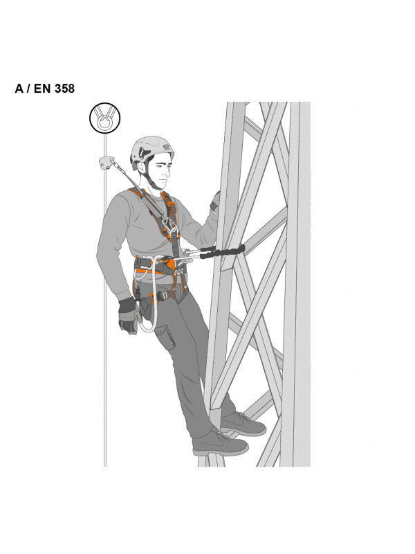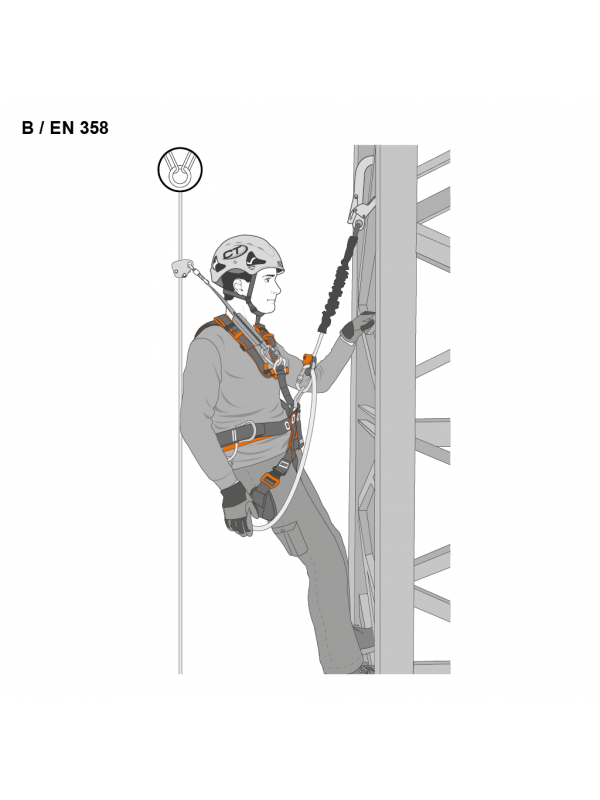 При использовании в соответствии с EN 358 в качестве стропа для позиционирования на рабочем месте его можно присоединить либо к боковым точкам крепления, либо к брюшной точке крепления страховочной привязи;