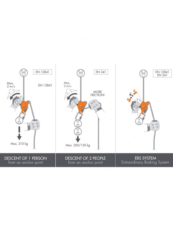 Самотормозящееся спусковое устройство для канатных работ разработано для высоких рабочих нагрузок. Позволяет оператору спускаться на рабочую линию, располагаться на рабочей линии и подниматься по той же веревке. Идеально подходит в случае вспомогательного спуска двух человек с устройством, установленным на анкере (оператор спускает спасателя и спасаемого) или для одновременного спуска двух человек (спасатель спускается вместе с пострадавшим).