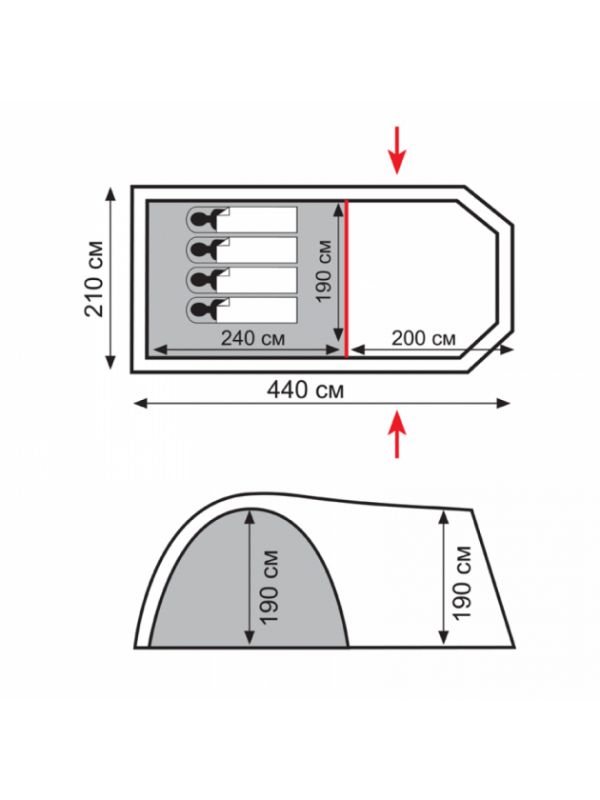 Размер тамбура 210 х 200 см. В нем разместится кемпинговая мебель.