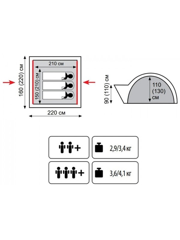 Все швы проклеены Характеристики: Тип палатки: Универсальная Форма палатки: Полусфера Вместимость, чел: 3 Длина, Ширина, см: 220/220 Высота, см: 230 Вес, кг: 4,1 Влагостойкость тента, мм: 4000 Влагостойкость дна, мм: 10000 Каркас: фибергласс 7,9 мм+сталь 16 мм Материал тента: 100% Полиэстер 75D/190T Ткань внутренней